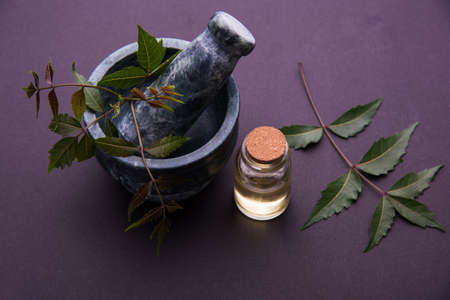 Ayurvedic Herbs Neem with Oil in bottle with mortar