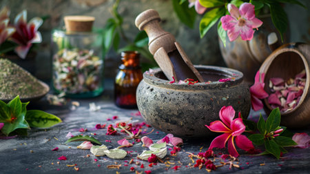 A captivating display of natural ingredients, including spices and herbs, arranged around a stone mortar and glassware, evokes a rustic kitchen vibe.
