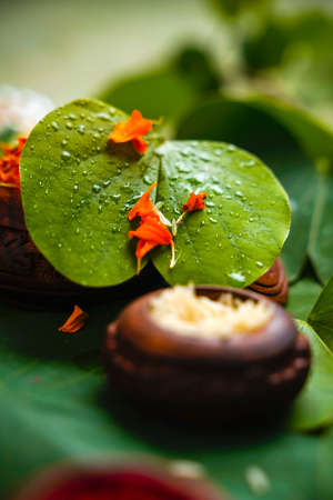 Abhyanga Snan on first day of Diwali - special herbal bath with ubtan or Utne, a mix herbal powder to have bath and scrub on the occasion of Diwali, selective focus