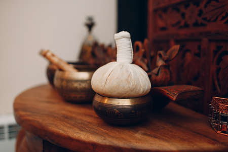 Kizhi or Herbal Bags Ayurveda Massage. Ayurvedic massage practitioner dipping cotton-wrapped herbal bundle into aromatic oil.