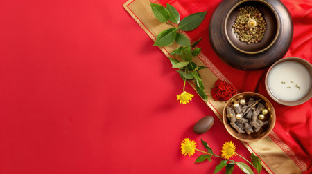 A vibrant and colorful traditional setup featuring aromatic spices, flowers, and candles displayed on rich red fabric, perfect for wellness and decor themes.