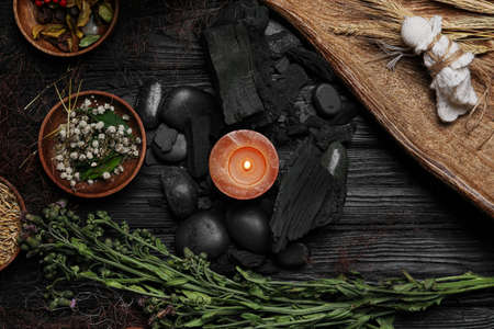 Stone mortar and pestle with different dried herbal ingredients and spices. Creative layout on dark grey background. Top view.