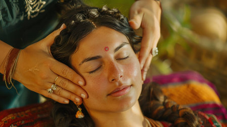 Relaxed woman enjoying a soothing facial massage in a tranquil setting, surrounded by natural elements and warm colors. Wellness and self-care concept.