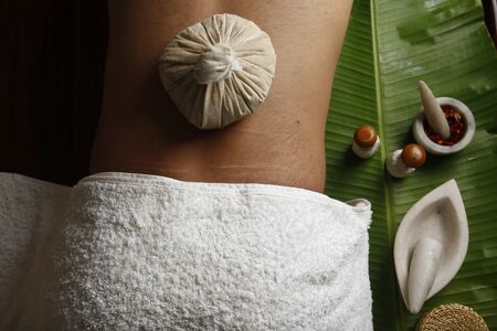 Ayurveda spa, a client receives a Pinda Sweda massage, a traditional Ayurvedic therapy known for its healing and rejuvenating properties.