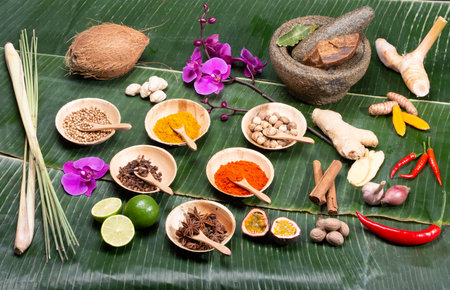 Flat layout famous Thai ingredient and food with mortar on wood background