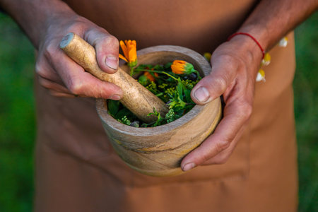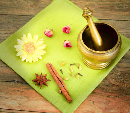 Alternative herbal medicine, Mortar with healing botanical herbs, Natural organic botany and scientific glassware, Natural skin care beauty products.