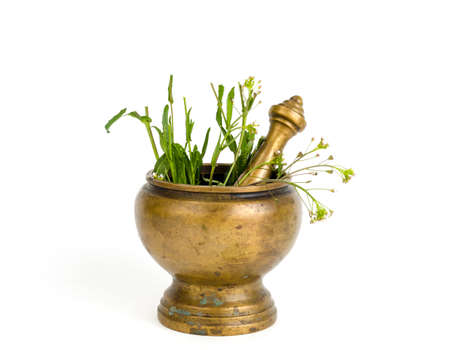 Medicinal plant in mortar. Alternative medicine. Studio Photo