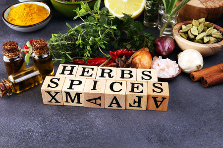 Spices and herbs on table. Food and cuisine ingredients and spices herbs sign with wooden cubes on table
