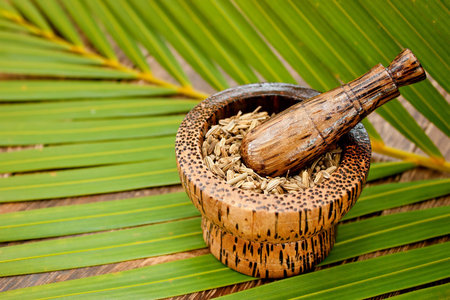 Caraway Seeds in Tradiational Wooden Mortar with space for text