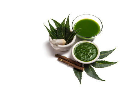 Medicinal Neem leaves in mortar and pestle with neem paste, juice and twigs on white background