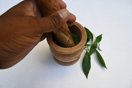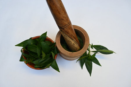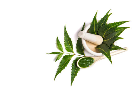 Medicinal Neem leaves in mortar and pestle with neem paste on white background