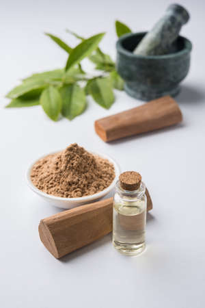 Chandan or sandalwood powder with traditional mortar, sandalwood sticks, perfume or oil and green leaves. selective focus