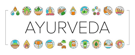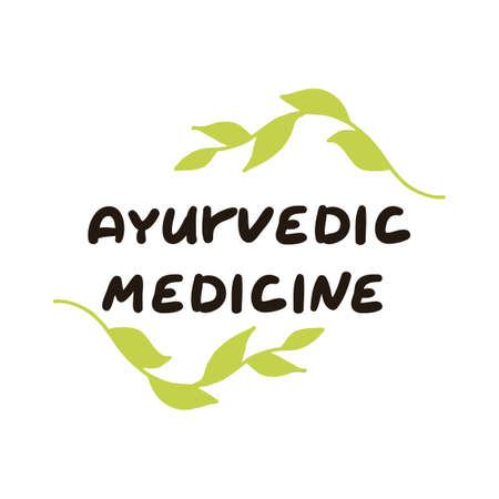 Ayurvedic medicine. Herbal treatment, traditional medicine. Suitable for packaging, web designs, advertising products, label. Hand drawn black lettering with green branches.