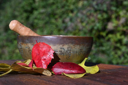 Tibetan Singing Bowls - horizontal healing meditation with pure positive vibes concept banner with blurred bokeh background and copy space for your text