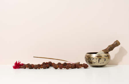 copper singing bowl and wooden clapper on a white table. Musical instrument for meditation, relaxation, various medical practices related to biorhythms, normalization of mental health