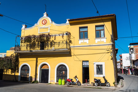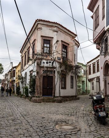 Ayvalik, Turkey - September 2021: Ayvalik old street view with historical buildings and architecture style. Ayvalık is a popular seaside town on the northwestern Aegean coast of Turkey.