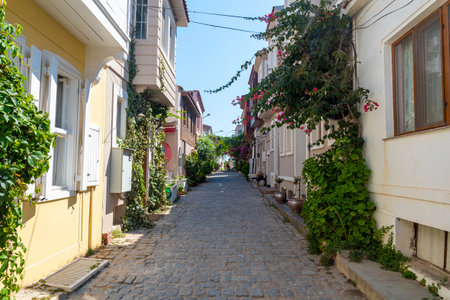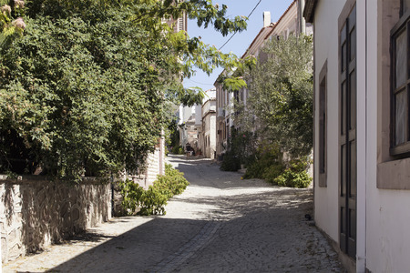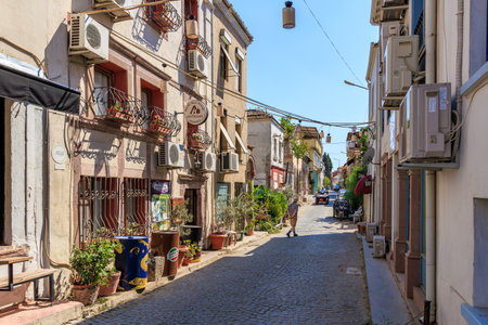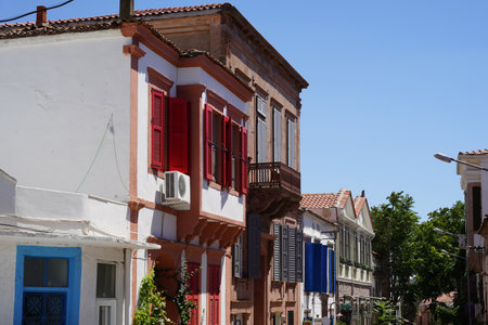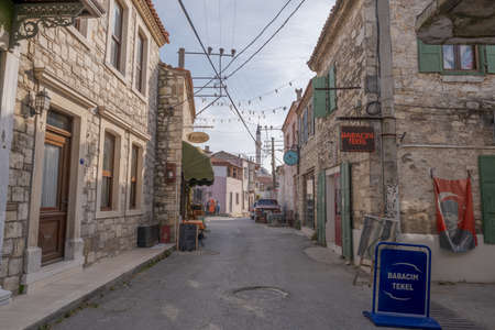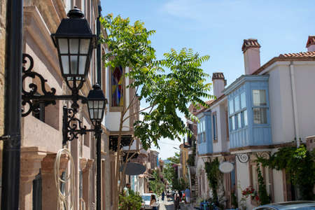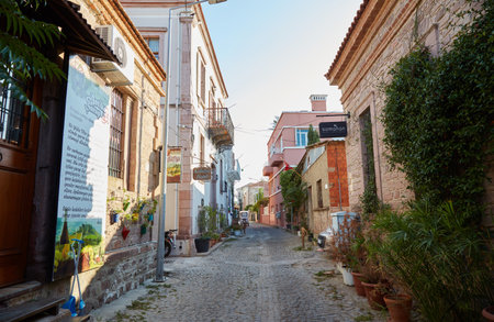 View of historical, old street in old town of Cunda (Alibey) island. Stone houses reflects Aegean architectural style. It's sunny summer day.