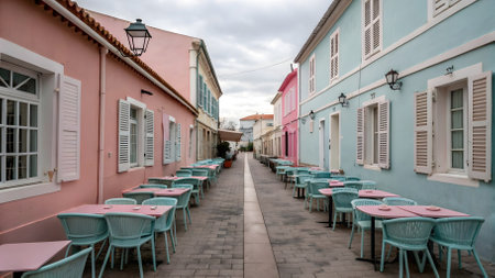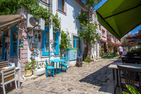 ALACATI, TURKEY - JULY, 11, 2021: Colorful Alacati Houses view in historical Alacati Town. Alacati is popular tourist destination in Turkey.