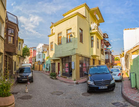 ISTANBUL, TURKEY - SEPTEMBER 27, 2013: Narrow street with old traditional wooden houses and filigree sidewalk in old Golden horn district.