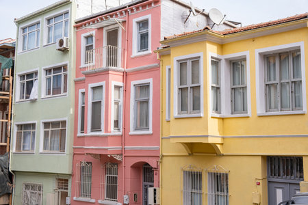 Colorful historic houses with ornate windows in Balat, Istanbul. Touristic district, attractions with historical sites. Colorful streets in Balat. Local and foreign tourists love this place