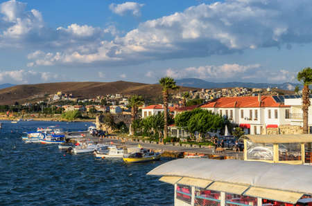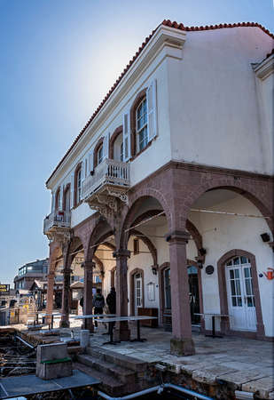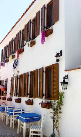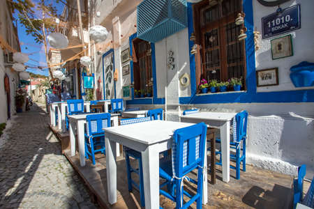 Ayvalik, Turkey -march- 13.2016: Restaurants and cafes on the Ayvalik coast. There are authentic old houses in the city. Sea and blue sky.