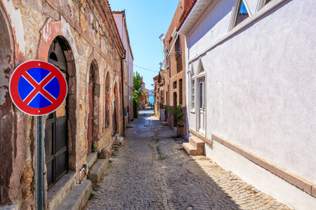 Narrow cobblestone alleyway with no parking sign in sunny mediterranean village. August 3, 2025, Ayvalik, Turkey.