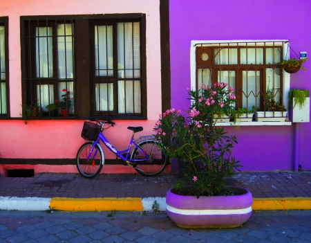 Bozcaada, Turkey, Colorful streets with old beautiful houses and bright flowers,