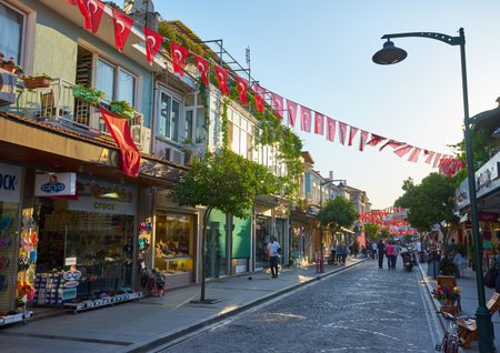 Gökçeada, Çanakkale, Turkey August 3, 2023: Tourists enjoying their holiday in Souvenir shops, coffee shops on narrow streets of Gokceada city center