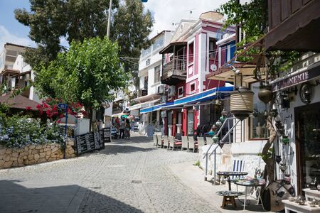 KALKAN, TURKEY - MAY 22 narrow streets of Kalkan town in Mediterranean Turkey with stone houses cobblestone paved road restaurants and shops 216