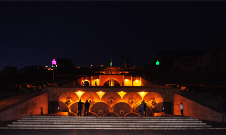 Yerevan, Armenia - October 05, 2017: view of Cascade complex with gallery of modern art and walking people in Yerevan at night