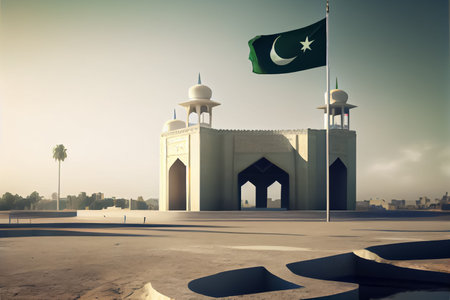 An AI generated illustration of the Pakistani flag waving in front of a mosque
