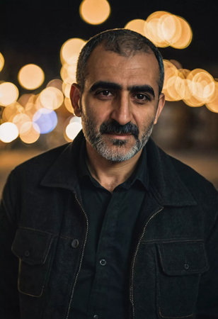 An Armenian man stands confidently against a backdrop of shimmering lights, showcasing a moment of charisma and presence. The urban nightlife adds a magical touch to his demeanor.