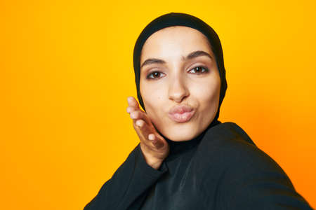 Muslim in black hijab posing fashion hand gesture isolated background