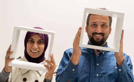 Pretty woman and man with a frame. High quality photo