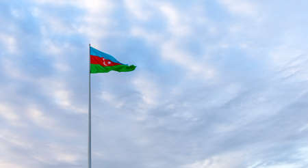 Waving in the wind flag of Azerbaijan on a background cloudy sky