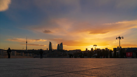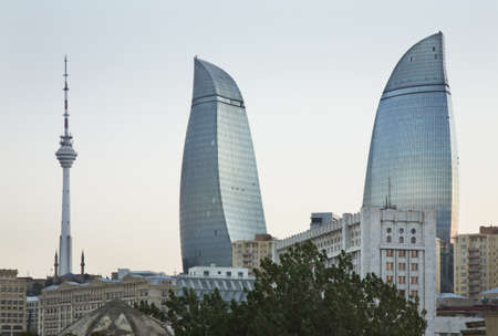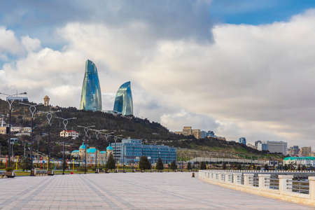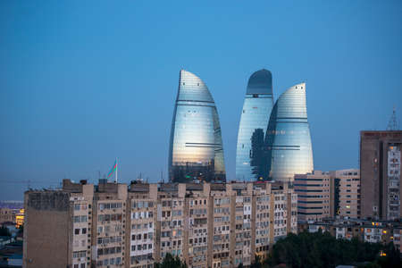 Panoramic cityscape view of Baku in the morning, capital city of Azerbaijan. Flame tower.