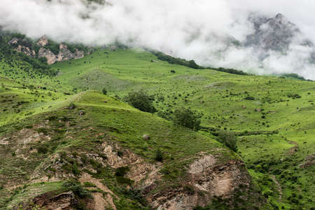 Rocky mountains and hills of Elbrus with low clouds. Gloomy lanscape.