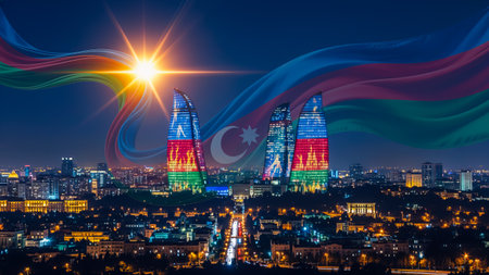 Azerbaijan flag in Baku, Azerbaijan. National sign background. Red Green Blue flag. Azerbaijan national flag with Crescent moon. Azerbaijan tradition patriotic. Flags waving wind