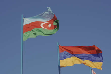 The national flags of Azerbaijan and Armenia are fluttering in the wind. state symbols