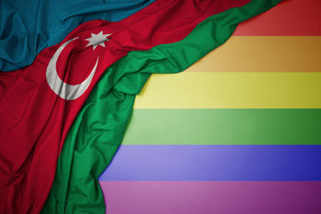 waving colorful national flag of azerbaijan on a gay rainbow flag background.