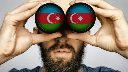 The Azerbaijani flag is reflected in the lenses of binoculars through which a bearded man looks