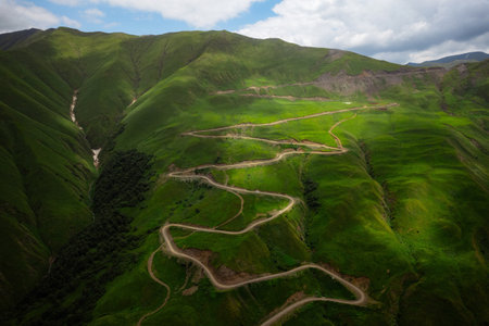 Picturesque mountain landscape with green slopes and road. North Caucasus
