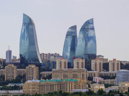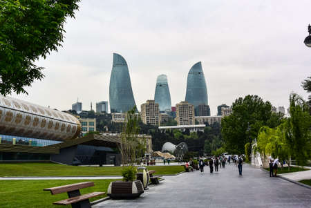 View of the Flame Towers in Baku, Azerbaijan