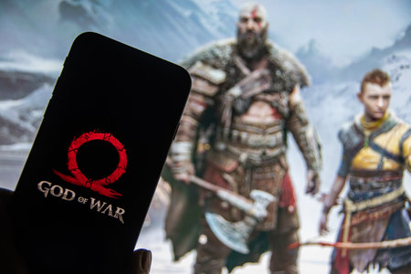 Rheinbach, Germany 8 December 2022, The logo of the game series God of War on the display of a smartphone (focus on the brand logo)