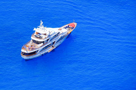 Aerial view of luxury yacht in turquoise sea. Top view