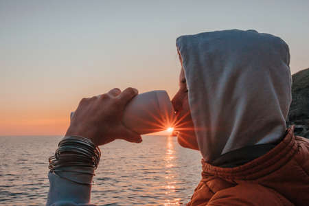 A young tourist Woman holding coffee tumbler cup while sitting outdoor and enjoying sunrise over sea mountain landscape. Womens yoga fitness routine. Healthy lifestyle, harmony and meditation