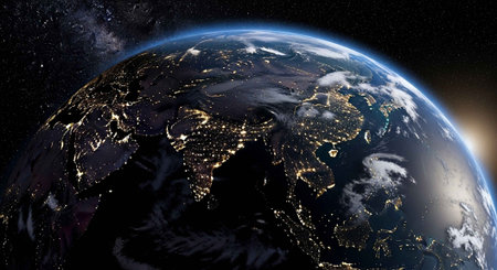 A stunning view of the Earth from space with city lights shining brightly at night