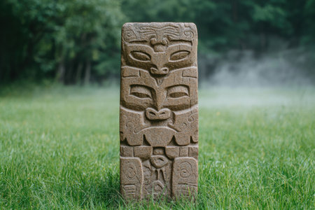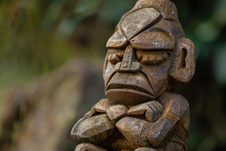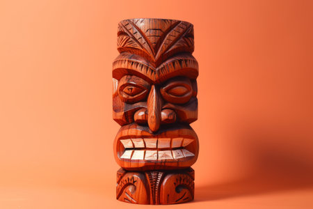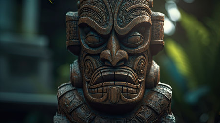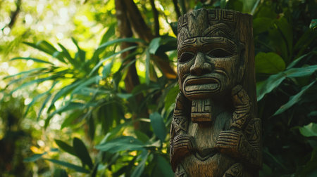 polynesian carved totem pole against tree-lined backdrop, created with generative ai