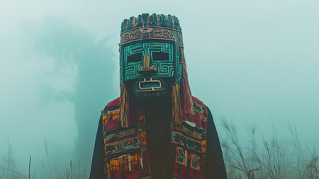A masked performer stands in a misty landscape, embodying rich cultural heritage and artistic expression. This unique image captures the spirit of tradition and mystery.