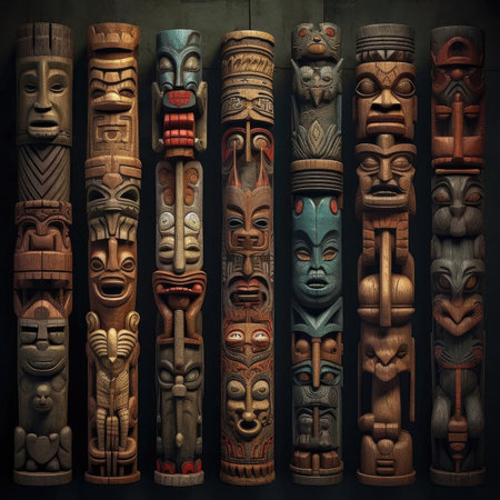Close up of colorful totem poles showcasing intricate carvings and vibrant colors, representing native american heritage